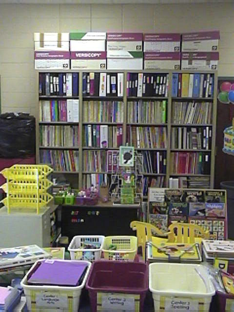 shelf are tubs that contain classroom supplies of crayons, glue, and scissors