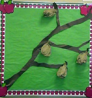 Bulletin Board - The cutest bulletin board can be made using the egg carton caterpillars and coffee filter butterflies from above. Draw a tree branch onto a piece of brown bulletin board paper and cut out. Attach the branch to your board. Have the students create cocoons/chrysalis from brown paper lunch bags by wading them up and smoothing them out. (They should no longer be stiff, but soft and pliable.) Put the caterpillars into the cocoon and staple them onto the branch on the bulletin board. One day when the students are out of the room, swap the butterflies for the caterpillars. Two weeks from the date they were hung, when the students are out of the room, tear holes in the sacks and pull the caterpillars through slightly as if they're emerging from their cocoons. The next day before the students arrive, have the butterflies scattered around the room.