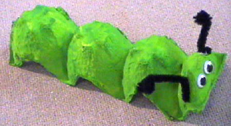 Egg Carton Caterpillar - Cut 3 egg cups from a cardboard or paper egg carton (not styrofoam), keeping them intact with each other. Have the students paint them yellow and green. Then hotglue wiggly eyes on. Puncture a hole on each side of the head for black pipecleaner antennae.