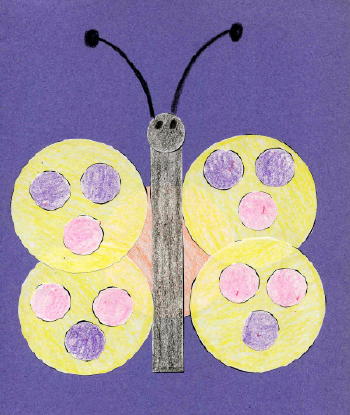 Shapes Butterfly - Use 5 large circles, 13 small circles, and one rectangle to make this butterfly. Students color shapes, cut out, then glue onto construction paper to form butterfly. Use a black crayon to add eyes and antennae.
