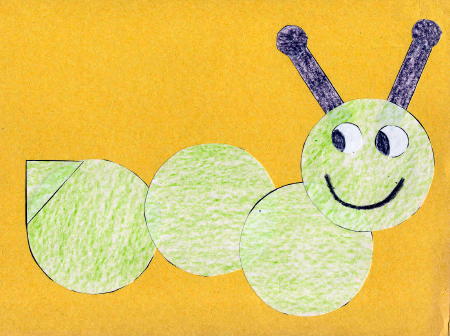 Shapes Caterpillar - Use 4 large circles, 4 small circles, one triangle, and two rectangles to make this caterpillar. Students color shapes, cut out, then glue onto construction paper to form caterpillar.